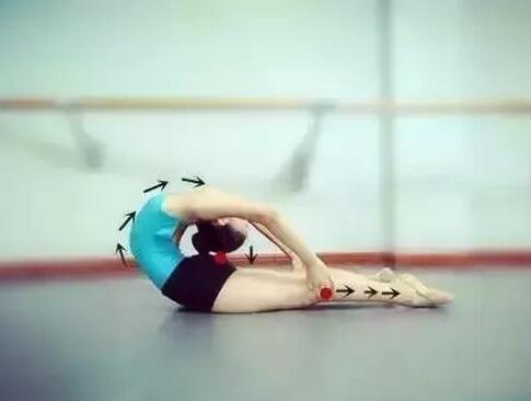 2、當腿能放下去以后,雙手可以向遠延伸,去找腳腕。