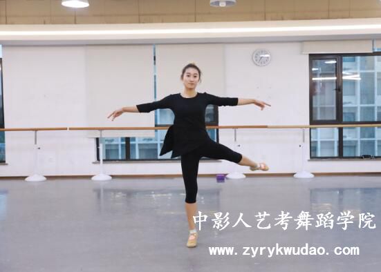 在左腳向前立半腳尖的過程中,重心直立,上身收緊,雙手叉腰,右腿吸腿旋轉一周。