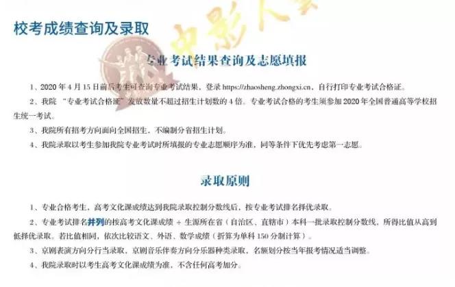 注:本簡章參考總結(jié)自2019年中戲招生簡章及中戲歷年招生簡章,其中招生專業(yè)、學費、各專業(yè)考試內(nèi)容以及錄取原則等內(nèi)容僅供考生及家長作為考前參考,望各位考生抓緊時間準備考試項目和作品,至于報名及考試時間還要坐等2020年招生簡章正式出爐,原則上安排在2019-2020學年度寒假考試后進行,藝術(shù)類專業(yè)校考一般安排在對應(yīng)的省級統(tǒng)考之后。