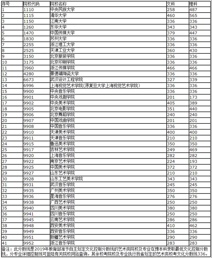 表一:2019年教育部準予自主劃定文化控制分數線的藝術類院校在豫本科錄取文化控制分數線