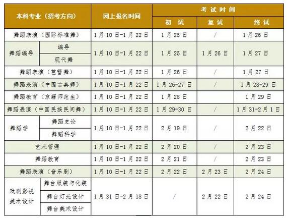 注:舞蹈教育專業兩個招考方向考試內容相同,考試時間不同。舞蹈教育(京籍師范生)的京籍考生需在初試檢錄時提供本人戶口本原件及復印件(復印首頁及個人頁),且對材料的真實性負責。
